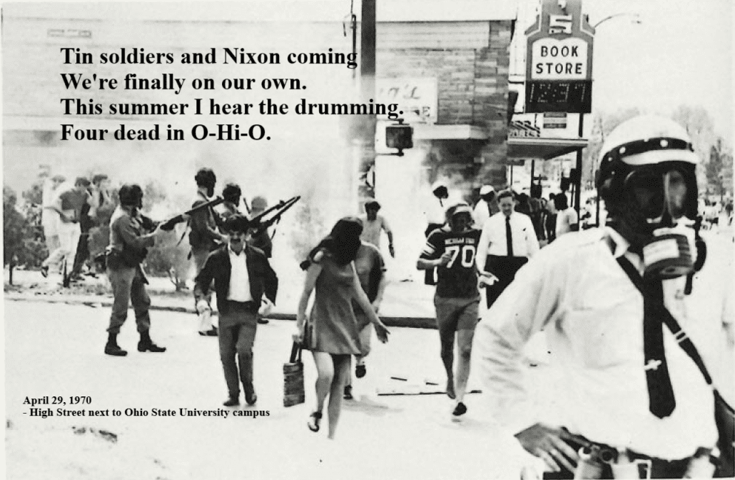 April 1970, Ohio Governor Rhodes sends troops to Ohio State to quash campus protests of Vietnam war